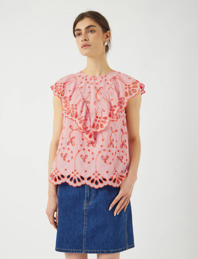 Denne toppen har en delikat blomsterbroderi og en vakker rynket halsringning. Toppen er laget av et lett og komfortabelt stoff, perfekt for varmere dager.