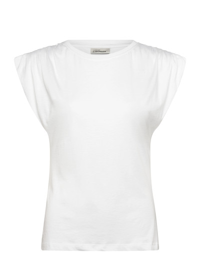 Sleeveless top featuring subtle shoulder gathers for a touch of structure. This garment offers a classic round neckline and a comfortable fit, making it a versatile addition to any wardrobe.