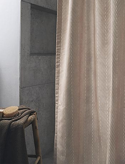 Exclusive antibacterial shower curtain printed with herringbone pattern with water effect. 12 eyelets for easy and beautiful hanging