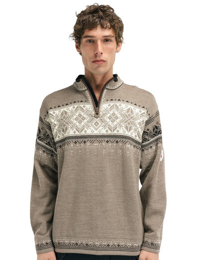 A timeless unisex sweater inspired by traditional Norwegian patterns, with elk leather trim along the zipper. Made with 100% lightweight wool.
