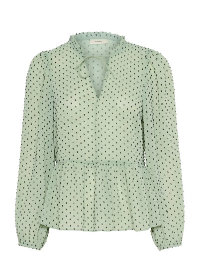 Bluzka CibiIW to stylowy i wszechstronny element garderoby, który można nosić zarówno na co dzień, jak i na specjalne okazje. Ma delikatny wzór w kropki i dopasowany krój. Bluzka ma ozdobny węzeł przy dekolcie i długie rękawy.