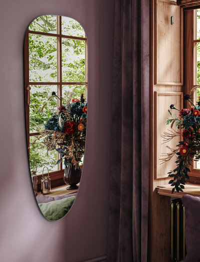 Organic mirror in clear glass, in a minimalist design. the mirror can be hung on both joints and fits in all rooms.