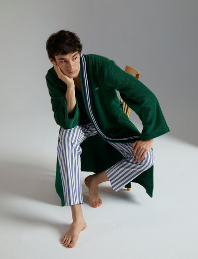 100% terry organic cotton, 400 g/m²available in three colours: blanc, marine and rouge.a stylish kimono made with 100% organic cotton by lacoste. the design has been inspired by vintage sports jumpers, with the iconic v shaped stripes featuring in three colours down the front of the kimono. also features two front pockets, the lacoste crocodile on the breast and a tone on tone belt.available in three sizes: medium, large and extra large.