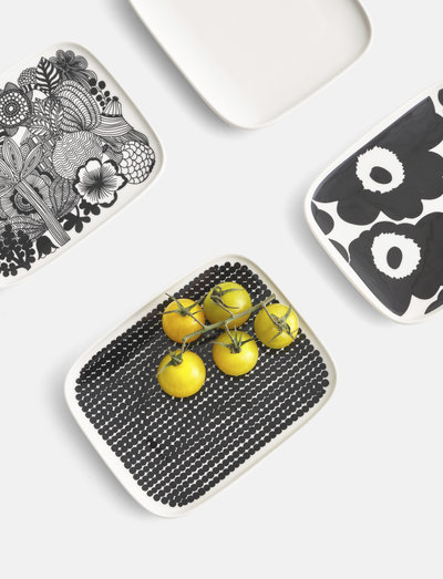 This small rectangular plate made of white stoneware features the räsymatto pattern. it’s dishwasher, microwave, and freezer safe; glazed colors and pattern remain vibrant.please remove the sticker from the bottom of the product before taking it into use. the sticker contains a small amount of metal.
