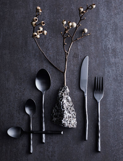 The Uta cutlery received its name from the Japanese Utareta which means hammered or beaten. The characteristic hammer marks on the water-black cutlery in combination with the cold steel sensation creates a tactile surface that keeps you grounded.
