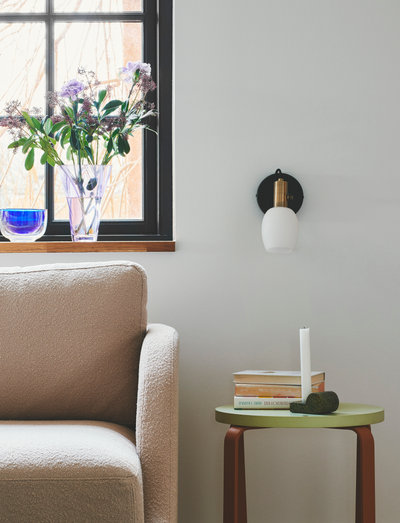 Arild is a series of lights in a modern design with an industrial touch. The white, round, matte opal glass shade is elegantly complimented by brownish brass details. You can easily adjust the lamp head for a directional light.