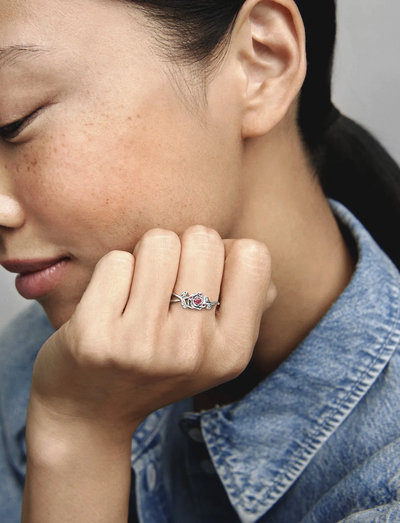 Zainspirowany historią starą jak świat, pierścionek ten posiada centralną czerwoną różyczkę z cyrkonii. Ażurowe liście i zakrzywione gałązki akcentują obrączkę, wraz z mniejszymi czerwonymi kamieniami, dzięki czemu jest to elegancki dodatek do każdego stroju.