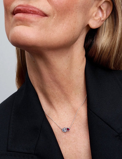 Dwa splecione serca w tym naszyjniku ze srebra próby 925 symbolizują głęboką miłość. Czerwony syntetyczny kryształ w kształcie serca i przezroczysta cyrkonia są otoczone błyszczącymi kamieniami pavé. Regulowany łańcuszek umożliwia noszenie go samodzielnie lub z innymi naszyjnikami, dodając romantycznego akcentu.