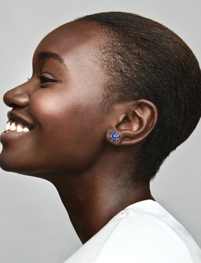 Te kolczyki sztyfty ze srebra próby 925, inspirowane kwiatami, zawierają skupisko sztucznych kryształów. Niebieskie kamienie w kształcie gruszki i markizy otaczają przezroczyste kamienie środkowe, tworząc symetryczny wzór. Noś je z innymi elementami inspirowanymi herbarium, aby uzyskać skoordynowany wygląd.