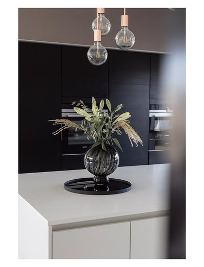 The Round Mirror Tray consist of a black metal tray and a mirror surface.