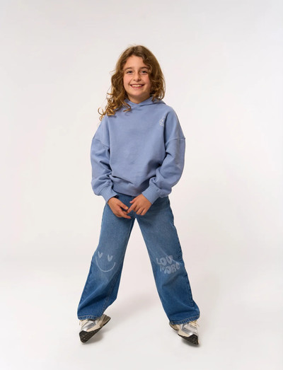 SzerokieStylish girl jeans with width in the legs and a happy face on the one leg and the text "Love more" on the other. In a classic medium blue denim color and with the cute print, the pants have plenty of charm and style. Wear these nice and charming THE NEW jeans as part of a casual everyday set, or pair them with a nice top for parties and special occasions.- Loose fit with wide legs (wide-leg).- Leg print.- Adjustable elastic in the waistband so the circumference can be adjusted as needed.- Functional pockets on front and back.- Belt loops.