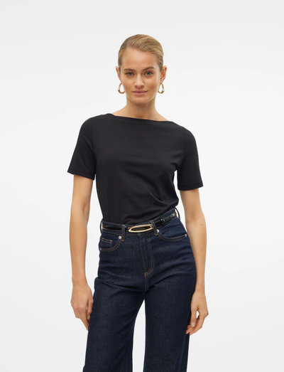 Ten podstawowy T-shirt charakteryzuje się dekoltem w łódkę i krótkimi rękawami. Regularny krój sprawia, że jest to wygodny i uniwersalny wybór na co dzień. Noś go z dżinsami lub spódnicą, aby uzyskać prosty, stylowy wygląd.