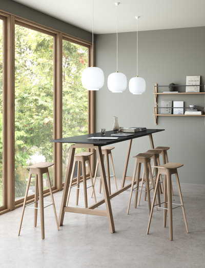 Pallen finns i flera varianter och stilar. Den vackra träbasen är tillverkad av ek och finns även i svart lack. Du kan välja mellan vadderad sits eller träsits. Stolen finns i två höjder och har den unika detaljen att den kan hängas på ett högt bord. Praktiskt och elegant - så enkelt är det.