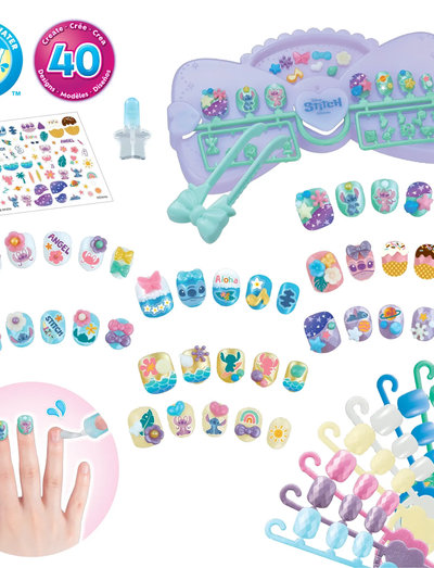 Stitch Nageldesignkit innehåller material för över 40 nagelkreationer: Aquabeads-naglar, dekorationer, arbetsbord, pincett, vattenpensel, klistermärken, designark och instruktioner.