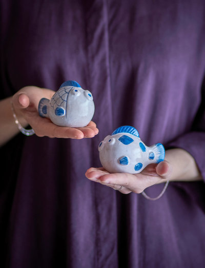 Fugu Salt & Peppar set från Bloomingville kommer som ett set om två och föreställer små fiskar i nyanser av blått och vitt. De är tillverkade av stengods med handmålad Deco, där mönstret och färgintensiteten kan variera. Ett finurligt och dekorativt tillskott till bordet.
