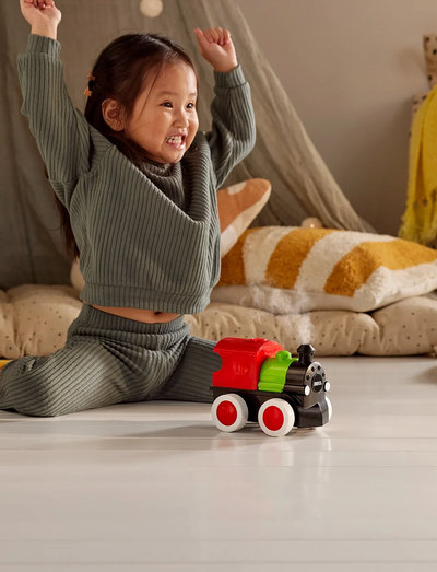 Tuta tuta! Följ med i tåget 30411 Steam & Go Train. Detta leksakståg är utformat för småbarn med en batteridriven tryck- och körmekanik som hjälper barns utveckling genom att stimulera finmotorik och rörelse. Tryck på knappen och tåget åker iväg och producerar ångeffekter som är säkra att röra vid från skorstenen när det kör genom rummet. Jaga ner det och låt det roliga börja igen.