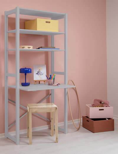 Den här ABC-bokhyllan heter Agger. Den är designad som en funktionell möbel med ett integrerat skrivbord som kan justeras i höjd och lutning. Möblerna är gjorda i furu, mäter 83 cm i bredd, och är ytmålade i färgen Mushroom. Perfekt för ett barnrum eller multifunktionsrum. Du kan välja djup och höjd på hyllan som du föredrar. Modellen på bilden är 179 cm hög och 40 cm djup. Observera dock att skrivbordet är 60 cm på djupet. Modellen levereras som standard med 3 hyllplan.