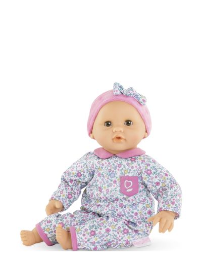 Corolle Calin Capucine - denna söta lilla docka är 30 cm och passar perfekt i små armar. Dockan har ett sött och uttrycksfullt ansikte, mjuk kropp och armarna och bena är gjorda av mjuk vinyl. Capucine är klädd i blommig pyjamas med matchande pannband. Hon kan sitta, hålla tummen i munnen och har blundögon. Mon Premier dockorna från Corolle passar perfekt som första docka för de minsta från 1,5 år. Corolle är ett franskt varumärke och deras dockor är kända för sin milda vaniljdoft, samma doft som används inom aromaterapi för att skapa inre ro, trygghet och välbefinnande. Vaniljdoften är självklart testad och godkänd. Corolle Calin går även att tvätta i 30 grader.