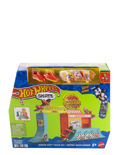Skapa rykande heta trick på fingerbrädan med skejtsetet Hot Wheels Skate Burger Spot! Den har flera olika kombinationer för att hitta på coola rörelser med flips, ollies och boardslides. Setet har utformats i samarbete med skejtboardlegendaren Tony Hawk och har cool grafik inspirerad av skejtkulturen och massor av ytor att skejta på. Barnen kan också använda den med sina Hot Wheels-bilar för ännu fler äventyr. (Hot Wheels-fordon säljs separat.) Innehåller en helt monterad, exklusiv fingerbräda och ett par avtagbara skejtskor. Färger och dekorationer kan variera.