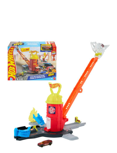Leksetet Hot Wheels City Super Rescue-brandstation inspirerar till kreativa lekar och äventyr med Hot Wheels-leksaksbilar. Kör in i carporten och förläng brandstationens stege för att skapa ett gravitationsfall på 40cm. Välj en av fyra olika utgångar: kör snabbt genom en stoppljusgrind, gör ett hopp för att släcka en brand, stanna till vid brandposten och vattenslangen för påfyllning eller kör iväg för att rädda dagen. Brandstationen kan roteras 360grader så att barnen kan välja vilken väg de ska ta. Basen har Speed Snap Track System-anslutningspunkter för att bygga ut leken. En Hot Wheels-brandbil i skala 1:64 ingår. Färger och dekorationer kan variera.