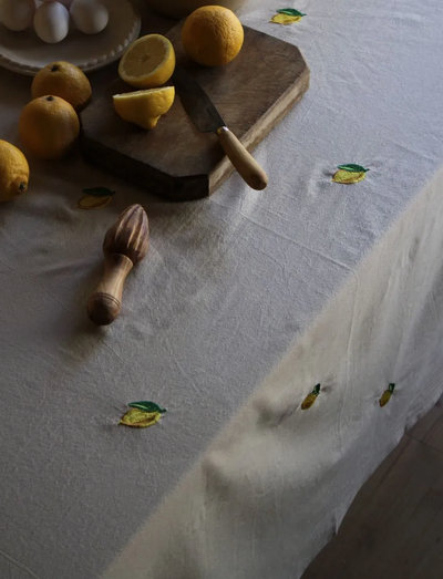 Bordsduken Lemon från svenska varumärket MIdnatt har en beige bas med gula citron-broderier. Duken kommer i fyra storlekar. Duken är GOTS-certifierad och tillverkad i 100% ekologisk bomull.