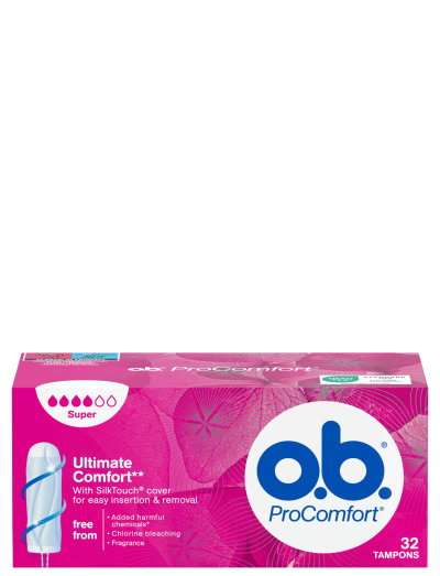 o.b. ProComfort Super är lätt att föra in och ger ett säkert skydd tack vare det lena SilkTouch-höljet och de unikt slutna kanalerna. Upp till 100 % skydd från läckage och säkert skydd i 4-8 timmar. o.b. ProComfort vår mest bekväma tampong, i o.b. sortimentet, för pålitligt skydd, så att du kan fokusera på att göra det du vill. Passar bäst vid riklig blödning.