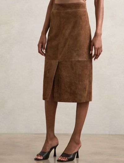 Crafted from luxurious suede, this straight-cut skirt features a front slit for unrestricted movement. A concealed zip fastening ensures a seamless fit, while the full lining provides all-day comfort, making it a versatile choice for any occasion.