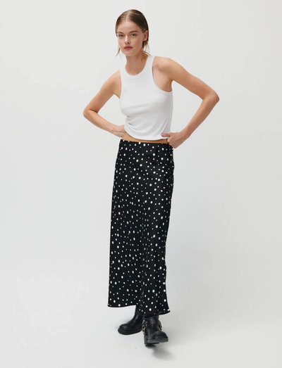 Den här kjolen är tillverkad av tung satin och ger en lyxig känsla och ett vackert fall. Den flytande silhuetten gör den till ett mångsidigt plagg för både dag- och kvällsbruk.