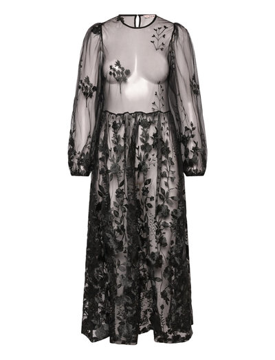 Fuschia Dress is a beautiful, long dress in transparent mesh with embroidered details. The dress has long, loose sleeves with elastic cuffs and closes at the back with a button.