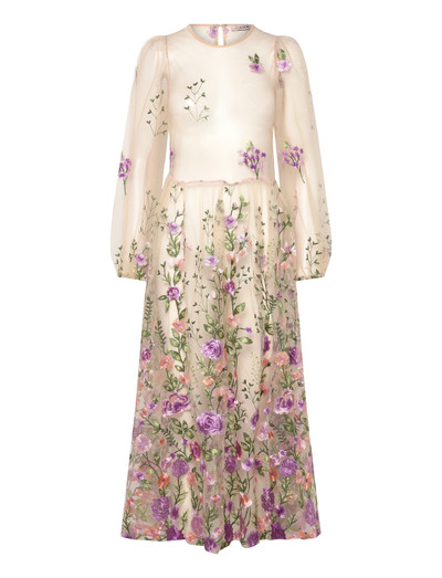 Den här klänningen har en delikat blommig broderi. Den har en flytande silhuett och en rund halsringning. Klänningen är perfekt för ett speciellt tillfälle eller en utekväll.