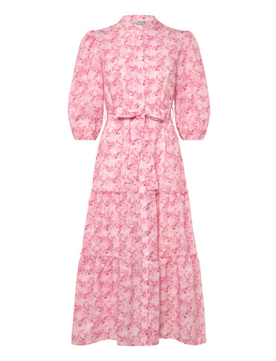 Den här klänningen har ett vackert blommönster och en smickrande passform. Den har en knapprad framtill, ett band i midjan och en lagerdelat kjol. Klänningen är perfekt för en mängd olika tillfällen, från avslappnade utflykter till speciella evenemang.