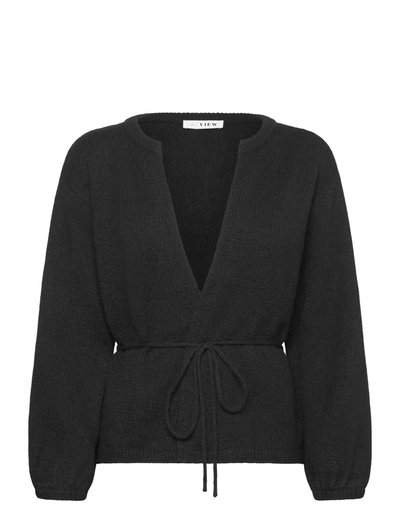 Denna stickade cardigan har en omlottdesign och knytband i midjan som skapar en smickrande silhuett. Det mjuka stickade materialet och de långa ärmarna gör den bekväm och stilren att bära i lager, och den djupa V-ringningen fulländar looken.