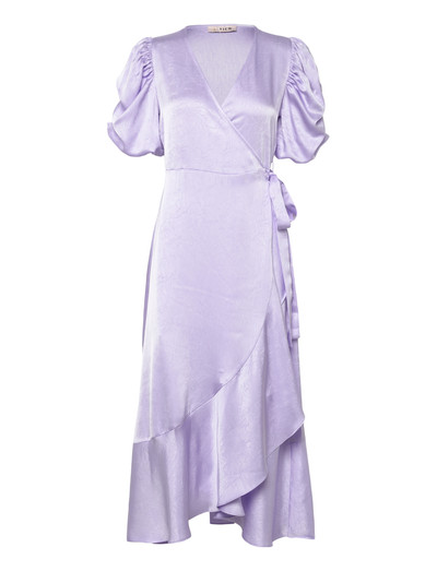 Denna omlottklänning är tillverkad i ett glansigt satinliknande tyg och har eleganta, korta puffärmar och en asymmetrisk volangkant. V-ringningen ger detta sofistikerade plagg en smickrande touch.