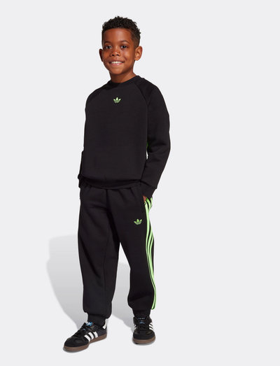 Det här setet för barn är perfekt för aktiva dagar eller avslappning och ger komfort hela dagen. Det mjuka fleecematerialet ger en skön känsla, medan den lösa passformen ger obegränsad rörelsefrihet. De karakteristiska 3-ränderna och Trefoil-detaljerna ger en sportig touch till både överdelen och underdelen.