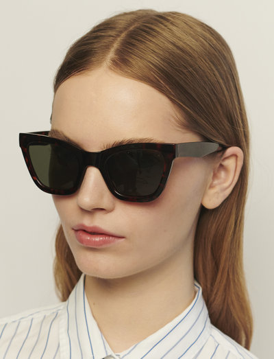 Dessa solglasögon är en något större tolkning av de klassiska cateye-solglasögonen, och de har skarpa kanter och mjuka övergångar som ger ett modernt uttryck. De har formbara skalmar med en metallkärna och optiska gångjärn av hög kvalitet. En rengöringspåse medföljer.