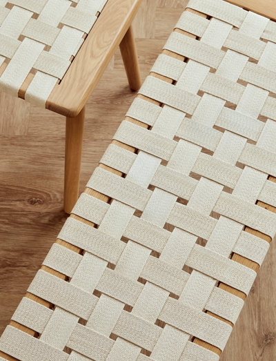 The Seat stool is carefully crafted from solid oak, featuring a beautifully woven seat made of Oeko-Tex-cotton. The elegant combination of oak and wide woven details ensures both high comfort and a classic, sophisticated appearance.