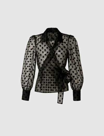 Denna blus definieras av sin omlottsilhuett och har voluminösa puffärmar och breda manschetter. Omlottbanden kan knytas till en rosett, vilket ger en touch av elegans till detta mångsidiga plagg.