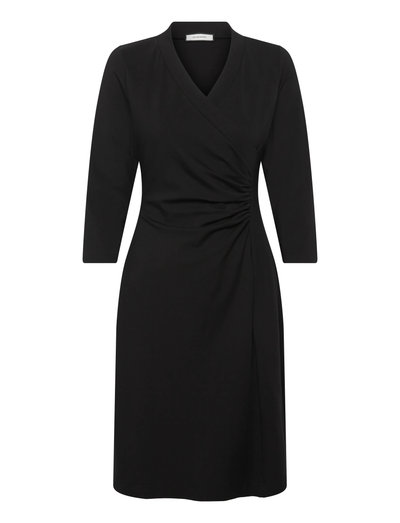 Denna jerseyklänning har en smickrande silhuett med V-ringning och eleganta 3/4-ärmar. Omlottdesignen ger en sofistikerad touch till denna bekväma modell.