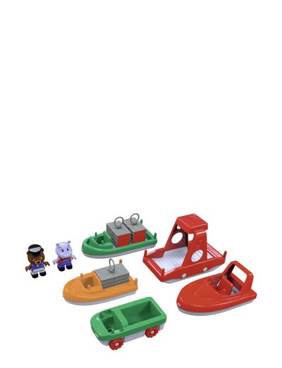 AquaPlay båtset innehåller fem olika fordon och två lekfigurer. Det är det perfekta tillskottet till alla vattenbanor från AquaPlay, samt passar även för lek i badkar, på stranden eller i poolen. Setet innehåller 1 containerbåt, 1 motorbåt, 1 amfibiebil, 1 transportbåt, 3 containrar med utdragbart lastutrymme och 360° roterbara transportöglor, 1 färja, samt lekfigurerna flodhästen Wilma och björnen Bo. AquaPlay båtset passar barn från 3 år. Tillverkad i Tyskland. AquaPlay från BIG - Bobby-Car fabriken.