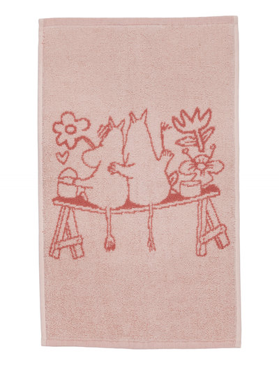 En mjuk och skön Mumin-handduk med kärlekstema. Motivet visar Snorkfröken och Mumintrollet som målar blommor på en vägg tillsammans. Illustrationen är baserad på serien “Mumin bygger ett hus” i vilken Mumintrollet börjar bygga ett hus åt sig själv och Snorkfröken. Moomin Arabia, handduk 30x50, Kärlek
