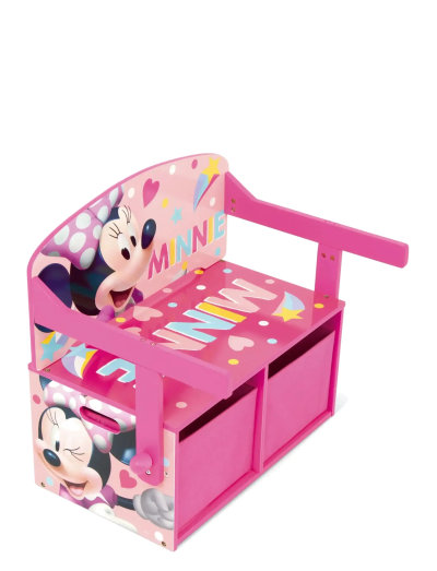This versatile 3-in-1 wooden toy bench, is an ideal addition to any children's room. The piece of furniture easily converts into a desk, providing extra functionality. Made of painted wood and MDF board, and decorated with a colourful sticker of favourite characters, this set brings a playful atmosphere to any room. The compact design takes up little space and fits perfectly in any children's environment. In addition to its function as a bench, it offers plenty of storage space for toys, costumes, balls and clothes thanks to the two integrated textile baskets. Its sturdy and safe construction ensures that children will have lots of fun with it, while contributing to a tidy and organised play environment.