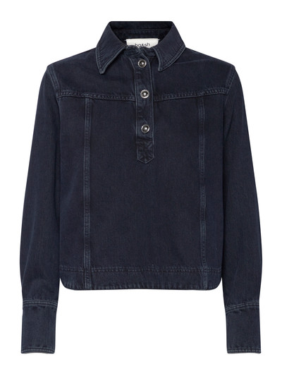 Denna topp är tillverkad av denim och har en krage och en knappslå. De långa ärmarna avslutas med manschetter med knappar.