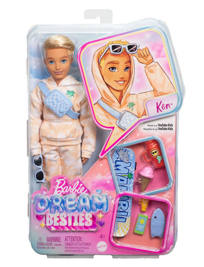 Barbie Dream Besties-dockorna uppmuntrar barnen att visa upp sina unika talanger för världen, precis som Ken gör! Ken drömmer om att skapa virala videor om att skydda miljön och djuren hjälp honom uppnå sina drömmar med nio olika tillbehör, som en skateboard, solskyddskräm, vattenflaska och telefon! Modedockan har också blont hår med mörkare rötter för roliga stylinglekar. Barbie Dream Besties-dockorna inspirerar barn från 4 år till att leva ut sina drömmar. Dockan kan inte stå utan hjälp. Färger och dekorationer kan variera.