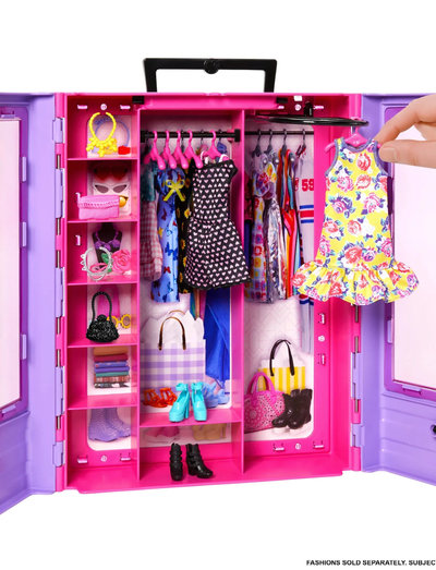 • I leksetet med barbie ultimate closet-tillbehör finns det stil både inuti och utanpå. garderoben har en lila utsida med rosa insida och är dekorerad med genomskinliga dubbeldörrar för att få en glimt av vad som finns inuti! en utfällbar ställning kan användas för att hänga upp kläder och är praktisk när du vill testa en annan stil. innehåller även 6 galgar. hyllorna fungerar både som förvarings- och visningsplats för accessoarer (ingår inte) och i garderoben finns plats för förvaring av en docka (ingår inte). bärhandtaget gör den enkel att ta med sig för många roliga lekstunder när du ska iväg! en perfekt present till barn som är 3 år och äldre, särskilt de som tycker om kläder, lek och mode!