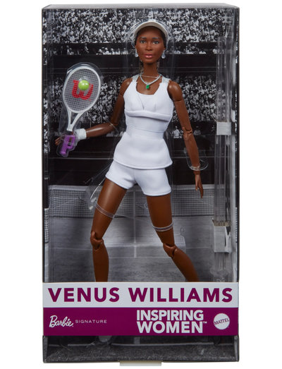 Barbie InspiringWomen-serien hyllar otroliga hjältinnor i sin tid modiga kvinnor som tog risker, ändrade regler och banade väg för generationer av tjejer att drömma större än någonsin tidigare. Trots könsmässig lönediskriminering under hela sin tenniskarriär var Venus Williams besluten att nå större framgångar både på och utanför planen. Hon krävde lika mycket prispengar för vinnaren av damernas tennisturneringar som herrarnas. Den här Barbie-samlardockan är formad efter hennes avbild och klädd i tennisdräkten från 2007 års turnering, inklusive solskärm, tennisracket och tennisboll, och hyllar världsmästaren i tennis och förespråkaren. Innehåller dockställ och äkthetsintyg. Barbie-dockan kan inte stå själv. Färger och dekorationer kan variera.