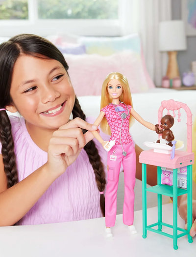 Barnen kan utforska alla typer av yrkesroller, som barnläkare! Setet innehåller en barnläkarmiljö med Barbie och hennes söta babypatient! Barbie har på sig ett rosa hjärtmönstrat set, redo att se till att barnen är glada och friska! Setet innehåller också ett undersökningsbord med stjärnmobil och en hylla undertill med plats för alla tillbehör, som en nappflaska och Barbies stetoskop. Fantasin kan få fritt utlopp i en värld full av berättelser och yrkesmöjligheter. Den här dockan är redo att visa barnen att de kan bli precis vad de vill! Dockan kan inte stå själv. Färger och dekorationer kan variera.