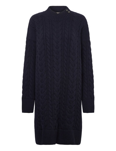 Håll dig varm och stilfull i denna stickade miniklänning. Ullblandningen har ett klassiskt kabelmönster, medan de avslappnade, nedhasade axlarna och funnel neck ger en bekväm passform. Mock horn-knappar i sidan tillför en lekfull touch, och ribbkanterna fulländar looken.
