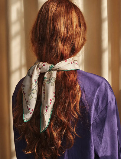 Delikata blad- och hjärtmotiv pryder denna lätta scarf. Den perfekta accessoaren för att lyfta vilken outfit som helst, detta stycke erbjuder en touch av elegans och lekfullhet.
