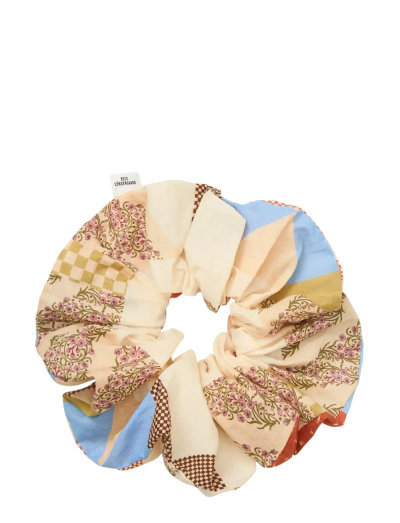 Denna scrunchie har en patchwork-inspirerad design och ger en lekfull touch till vilken frisyr som helst. Den elastiska designen säkerställer ett säkert och bekvämt grepp, vilket gör den till en praktisk och stilfull accessoar.