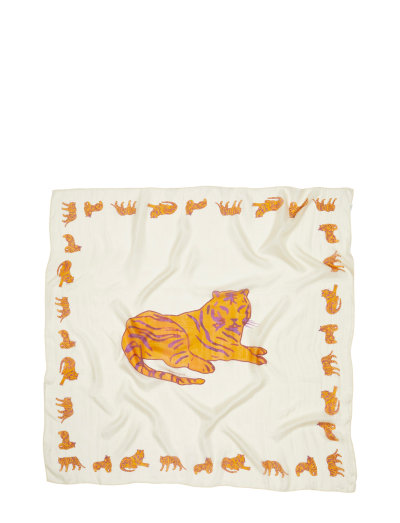 Denna lätta scarf har ett slående tigermotiv som ger en lekfull touch till varje outfit. Designen har en kant av mindre kattdjursfigurer, vilket förstärker dess unika utseende och gör den till en framstående accessoar.